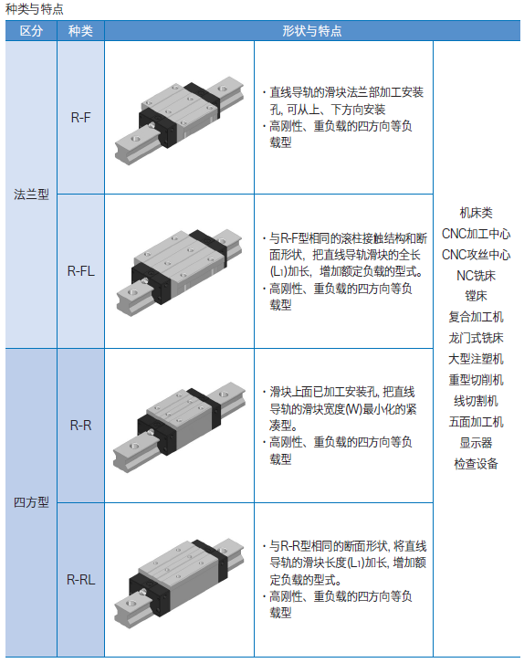 f. 與相同尺寸的鋼球型直線導軌相比, 具有更大的基本額定負載, 有利于設備的小型化, 使用相同尺寸也能獲得更長的使用壽命。
